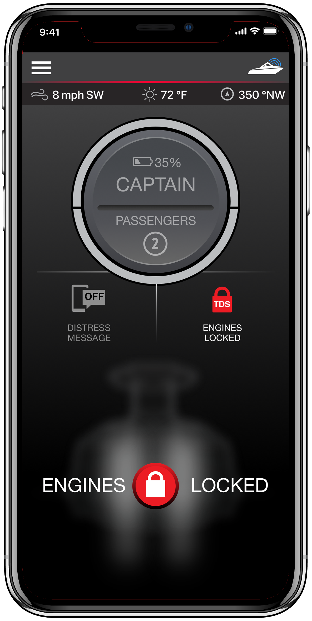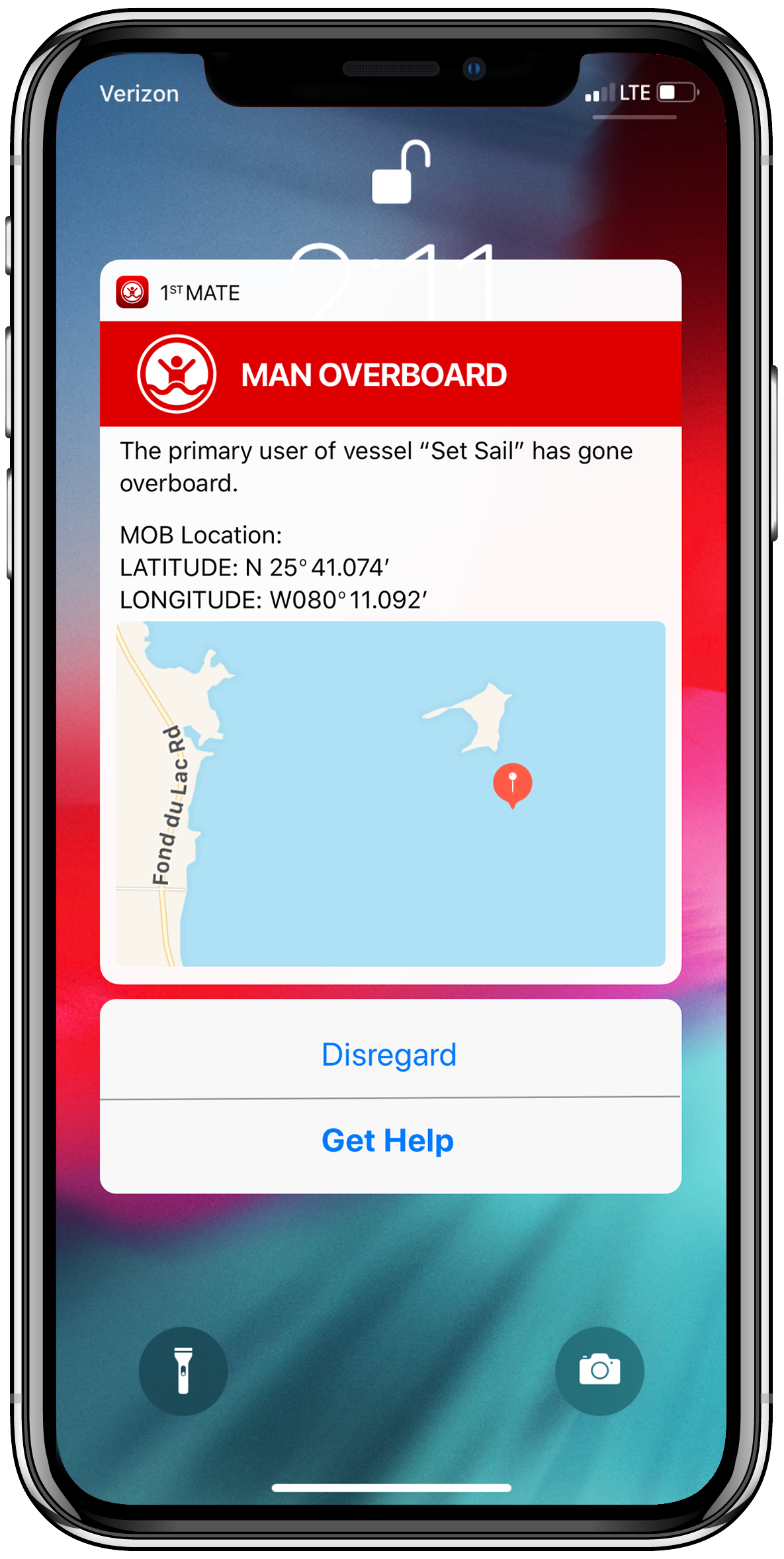 Såfremt kaptajnen, der bærer et tilkoblet vedhæng falder overbord lyder et højt signal fra 1st Mate kontrolboksen samt på mobil app ´en. Motorerne stopper og passagerer ombord modtager instruks om hvordan de kan vende båden og hente kaptajnen op af vandet. Sejler kaptajnen alene, udsendes en nødbesked til personer i mobilens nødkontakter med information om GPS koordinater, sted og tid.